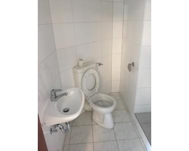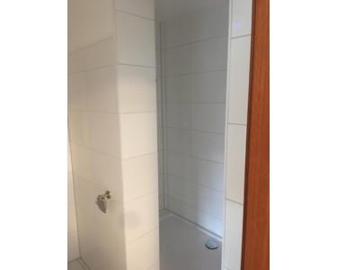 Eine zweckmäßiges Badezimmer mit Dusche/ Waschbecken und WC.