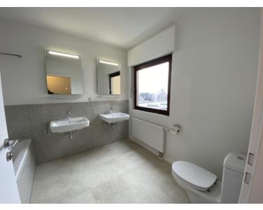 Links von der Eingangsdiele kommt man über den Flur zu den drei Räumen - Elternschlafzimmer, Kinderzimmer und Arbeitszimmer und links in das Bad mit Wanne, Dusche, zwei Waschbecken und Toilette.