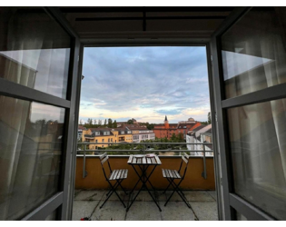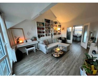 Das Wohnzimmer mit Balkon hat eine Dachschräge und eine bis zu 4m hohe Decke. Zur Verfügung stehen ein Samsung Frame Fernseher.