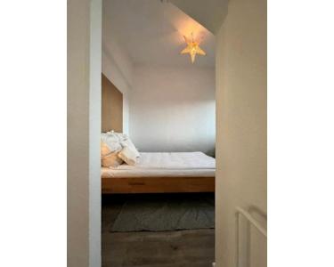 Im Schlafzimmer befindet sich ein Bett und eine Kommode.