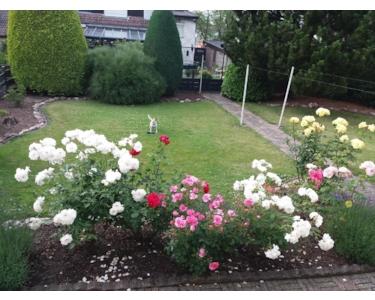 Im Erdgeschoss befindet sich eines der zwei Tageslichtbäder, ein großes Wohnzimmer und die geräumige Wohnküche mit direktem Zugang zur großen überdachten Terrasse und dem schön angelegten Garten.