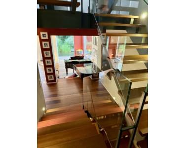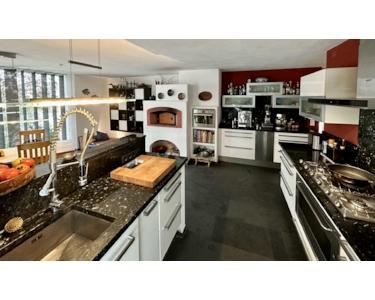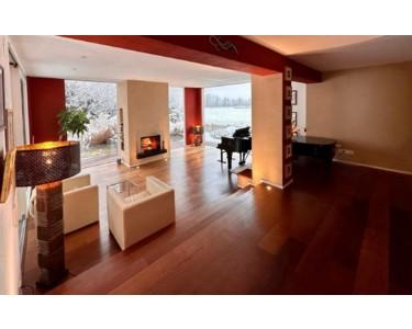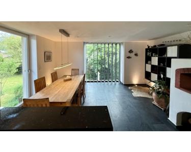 Das über 60 m2 Wohnzimmer auf zwei Ebenen bietet einen unverbaubaren freien Blick auf die umliegende Natur und Garten. Auch die Wohnküche-mit einem modernen Pizzaofen- ist mit viel Glass gestaltet und mit Blick ins Grüne. Drei große Schlafzimmer, eins davon mit eigenem Bad, haben alle offene Holzbalkendecke. Das Haus wurde als Split Level erbaut, was der Unterteilung der Räume viel Unabhängigkeit und einen besonderen Wohnflair verleiht.