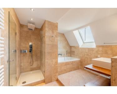Badezimmer mit XL-Badewanne und Regenkopfdusche