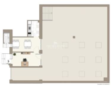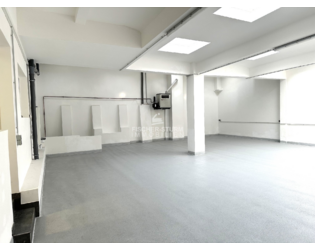 Eine breite Treppe führt von der gut über Dachfenster ausgeleuchteten Halle (ca. 154 m²) ins Untergeschoss. Hier befindet sich eine ca. 57 m² große Lagerfläche. Eine WC-Einheit (vom Hof zugänglich) gehört ebenfalls dazu.