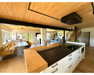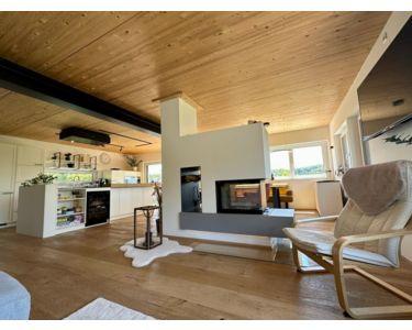 Die offene Architektur mit lichtdurchfluteten Räumen, Eichenparkett und einem beidseitigen Holzkamin schafft ein stilvolles Ambiente.