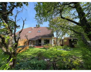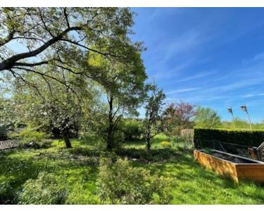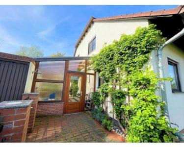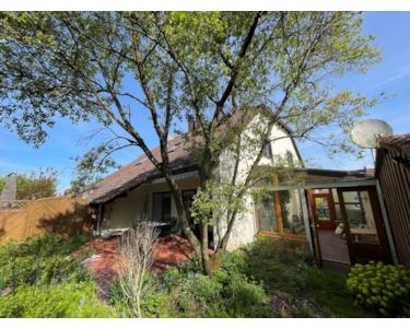 Doppelhaushälfte am südöstlichen Ortsrand mit altem Obstbaumbestand und Blick auf die angrenzenden Wiesen.