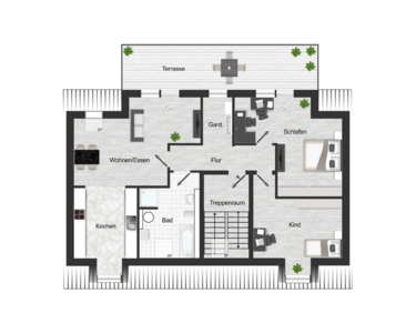 Das Highlight der Wohnung ist die großzügige Dachterrasse mit Blick in den begrünten Innenhof, die sowohl vom Wohnzimmer als auch vom Schlafzimmer aus bequem zu erreichen ist. Sie bietet reichlich Platz für eine komfortable Sitzlounge, eine Grillecke und lädt, zum Entspannen in der Sonne oder zum Ausklang des Tages, ein. Ein privater Rückzugsort unter freiem Himmel. Ergänzt wird dieses Highlight durch den lichtdurchfluteten Wohn- und Essbereich, der dank seiner offenen Gestaltung ein besonders angenehmes und einladendes Raumgefühl vermittelt. Die offene Küche ist funktional angebunden und bietet ideale Voraussetzungen für gemeinsames Kochen und geselliges Wohnen. Große Fensterflächen sorgen für viel Tageslicht und schaffen eine freundliche, einladende Atmosphäre. Das Schlafzimmer überzeugt nicht nur durch seine angenehme Größe, sondern auch durch sein durchdachtes Raumkonzept, das die Einrichtung einer separaten Büro- bzw. Arbeitsecke ermöglicht, ideal für Homeoffice oder einen ruhigen Rückzugsort zum Arbeiten. Das großzügige Tageslichtbad ist mit einer Badewanne, einer separaten und ebenerdigen Dusche sowie einem praktischen Waschmaschinenanschluss ausgestattet und verbindet Komfort mit Funktionalität auf hohem Niveau. Der liebevoll gestaltete, begrünte und abgeschlossene Innenhof schafft eine ruhige, private Atmosphäre und bietet Ihnen neben einem Sandkasten zusätzliche Abstellmöglichkeiten für PKWs und Fahrräder.