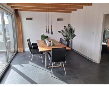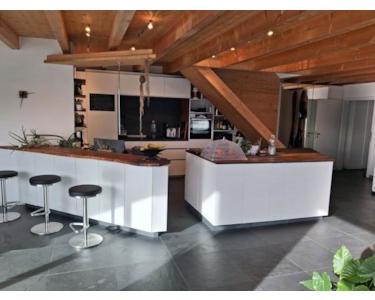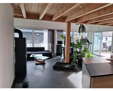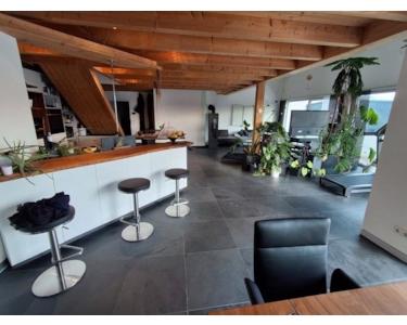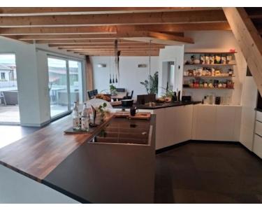 Die Wohnung überzeugt durch ihre großzügige Raumgestaltung mit offenen Flächen, bodentiefen Fenstern und einer modernen, designorientierten Ausstattung. Die begehbare Regendusche, eine Float-Badewanne, eine riesige Küche mit Deckenwasserhahn, und der drehbare Design-Holzofen setzen Akzente. Der Galerie-Bereich bietet zusätzlichen Stauraum und kann an die individuellen Bedürfnisse angepasst werden.