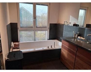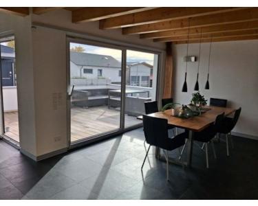 Die hochwertige Ausstattung umfasst unter anderem Naturstein-Schieferböden, wandgleiche Alu-Sockelleisten und Echtholz-Parkett, Fussbodenheizung.