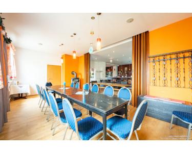 Ein voll ausgestatteter Küchenbereich mit separatem Spülraum sowie zwei Abstellräume sorgen für eine effiziente und reibungslose Betriebsführung. Ergänzt wird das Raumangebot durch getrennte WC-Anlagen für Damen und Herren, jeweils mit Vorraum.