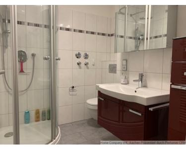 Vor dem ansprechenden Duschbad befindet sich auch die Waschmaschine im separaten Abstellraum in der Wohnung.