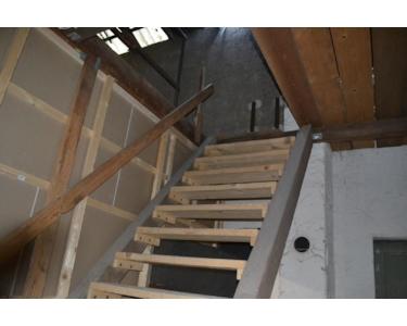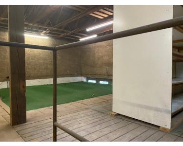 Der obere Hallenbereich mit einer Gesamtfläche von 76 m² ist über eine Holztreppe zugänglich.