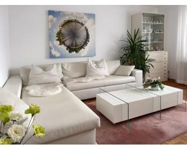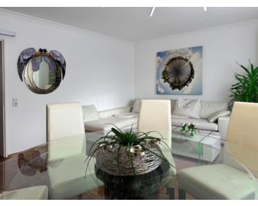 Das Echtholz-Parkett wurde aufwändig überarbeitet und versiegelt, viele stilvolle und praktische Details wurden umgesetzt – darunter die echten Stuck-Decken-Profile im Wohnraum oder die Ganzglas-Schiebetüre zur Diele.