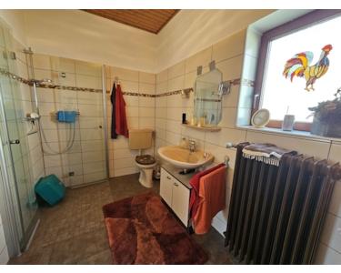 Der hintere Flurbereich bietet Zugang zum Garten, und dient der Zeit als Heizungsraum/Heiztechnik und Hauswirtschaftsraum. Von hier aus gelangen Sie ebenfalls zu einem großen Duschbad mit Fenster sowie einem separaten Gäste-WC. Der Abstellraum bietet einiges an Stauraum für Vorräte, Haushaltsgeräte und Reinigungsutensilien.