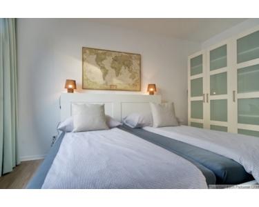 Das Schlafzimmer verfügt über ein Doppelbett (1,60 x 2,00), eine Kommode und einen Kleiderschrank. Ein weiß gefliestes Badezimmer mit beleuchtetem Spiegel gehört zur Wohnung.