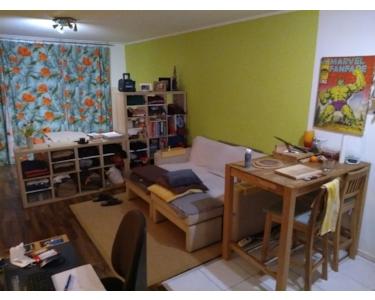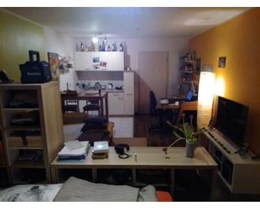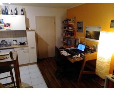 Wenn man die Wohnung betritt, dann steht man direkt in einem geräumigen Flur. Hier ist genügend Platz um eine Garderobe und einen großen Schrank zu platzieren. Rechts befindet sich dann direkt das modern geflieste Badezimmer. Ausgestattet mit Waschbecken, Toilette und Badewanne bietet es ausreichend Platz für die tägliche Körperpflege. Durch den Flur geradeaus befindet sich der Wohnraum mit Blick auf die Grünanlage und der angrenzenden Terrasse. Dieser ist sehr groß geschnitten und kann gut in Wohn- und Schlafbereich unterteilt werden. Auf der rechten Seite befindet sich dann die Küchenzeile. Diese ist ausgestattet mit einer Spüle, zwei Herdplatten und einem Kühlschrank. Die Küche ist bereits in Mietpreis enthalten. In der gesamten Wohnung ist Laminat verlegt. Einen Tiefgaragenstellplatz können Sie auf Wunsch anmieten.