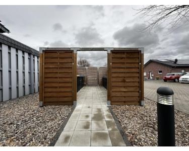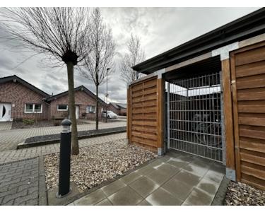 Links und rechts des Hauses befinden sich jeweils fünf Carports, ausgestattet mit gemeinschaftlich genutzten E-Ladesäulen. Die Abrechnung erfolgt nutzerbezogen über individuelle Chips; derzeit ist die Nutzung durch E-Fahrzeuge gering, sodass weitere Ladesäulen problemlos ergänzt werden können. Zusätzlich sind die Carports mit Ring-Überwachungskameras gesichert. Im linken Eingangsbereich befindet sich der Fahrradunterstand, im rechten Bereich die Mülltonnenbehausung.
