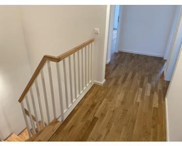 - Echtholztreppe und glatte weiße Wände für modernes Ambiente