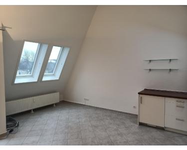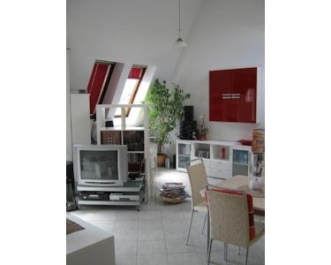 Sonniges und gemütliches Studio mit Dachgeschoss-Flair für Singles. Die hohen Decken und Südfenster machen den Wohn-Essraum zu einem lichtdurchfluteten Wohlfühlraum.