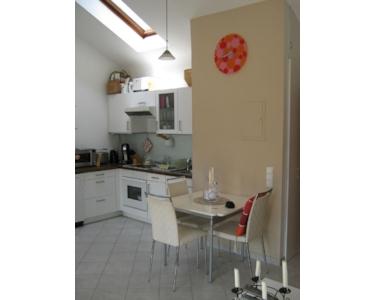 Die Einbauküche ist mit Kühlschrank, Ceranfeld-Herd und Backofen ausgestattet.