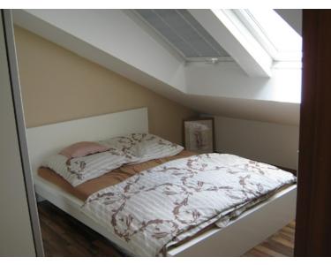 Das Schlafzimmer ist nach Norden ausgerichtet und mit 2 großen Dachfenstern und Blick auf den Nachbarsgarten schön hell und ruhig. Hier ist auch eine kleiner, beleuchteter Abstellraum unter der Dachschräge als Lagerfläche zu finden.