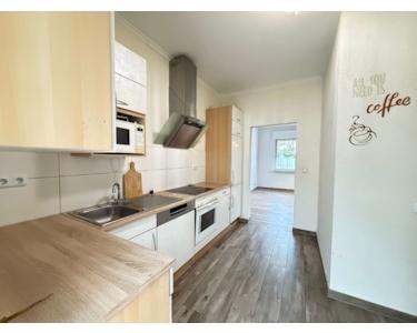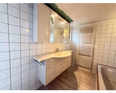 Die Einbauküche ist einfach, aber funktional – sie bietet alle wichtigen Geräte und kann mit etwas handwerklichem Geschick modernisiert oder nach eigenen Wünschen umgestaltet werden. Das Badezimmer wurde bereits zwischenzeitlich modernisiert und überzeugt durch seine helle Gestaltung, eine komfortable Badewanne sowie eine ebenerdige Dusche. Hier zeigt sich, dass klassische Bausubstanz und moderne Elemente wunderbar harmonieren können.
