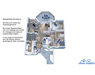 Jede Ebene hat ihr eigenes großes Tageslichtbad, was dem Leben einer Familie extrem entgegenkommt ... oder selbst für eine 'junge' (WG 55+) Senioren-Wohngemeinschaft mit 6 Zimmern (je 2 Zimmer teilen 1 Bad) findet hier Platz und das komplette EG mit Küche Esszimmer und über 40m² Wohnzimmer, sowie Garten und Pool bilden Gemeinschaftsflächen. Allein das zeigt, dass es gerade für Familien mit Kids, oder mehreren Generationen geeignet ist.