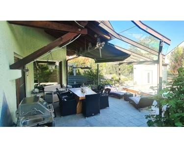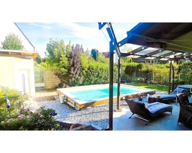 Vor dem Haus gibt es noch weitere Stellplätze und hinter dem Haus den ausreichend großen Garten (15x12m) mit kleinem Pool (ca. 3,5x5m). Die sehr große überdachte Terrasse, sowie eine Sonnenterrasse und Grünflächen zum Erholen und Feiern mit Gästen, laden zum Verweilen ein.