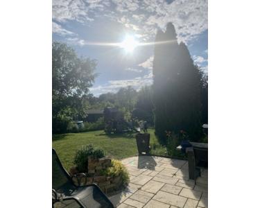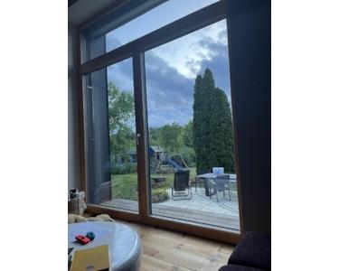 Das Wohnzimmer öffnet sich durch ein großes Terrassenfenster zum Garten hin und zieht den Blick ins Grüne. Auf der Treppe zur Terrasse lassen sich Sonnenuntergänge bei einem Glas Wein genießen, im Dunkeln kann man vom Sofa oder der Liege aus die Sterne beobachten. Der Kaminofen schafft Gemütlichkeit an kalten Tagen.
