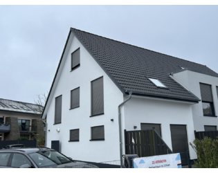 Die Immobilie präsentiert sich in moderner, klarer Architektur mit weißer Putzfassade und anthrazitfarbenem Satteldach. Elektrische Rollläden an allen Fenstern sorgen nicht nur für Sicht- und Sonnenschutz, sondern unterstreichen auch den zeitgemäßen Charakter des Hauses.