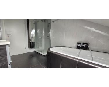 Modernes Tageslichtbad mit großer Glasdusche (1,4 m x 0,9 m) und großer 8-Eck-Acrylbadewanne