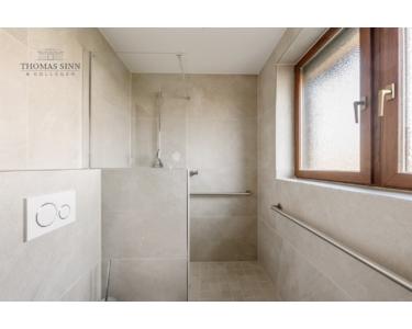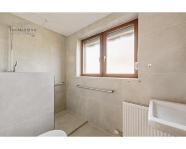 Über eine markante Wendeltreppe erreichen Sie das OG. Hier stehen Ihnen drei Zimmer sowie ein neuwertiges Badezimmer mit bodentiefer Dusche zur Verfügung. Das Elternschlafzimmer und ein Kinderzimmer sind ruhig zum Garten hin ausgerichtet, während sich das dritte Zimmer ideal als weiteres Kinderzimmer, Homeoffice oder Gästezimmer nutzen lässt.