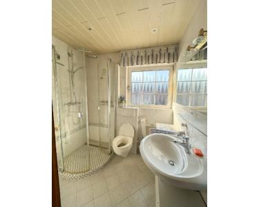 Das Obergeschoss besteht aus einem Elternschlafzimmer, zwei Kinderzimmern und einem hellen Badezimmer. Das Bad ist mit einem Waschbecken, einer Dusche mit Glaselementen und einem Hänge-WC ausgestattet, deckenhoch gefliest und mit Feuchtraumpaneelen sowie Einbaustrahlern versehen.