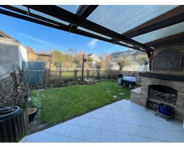 Die überdachte Terrasse im Garten ist mit Holz und Doppelstegplatten gestaltet und verfügt über einen Ofen/Grill, der für gemütliche Stunden sorgt. Der Garten ist vollständig eingefriedet und bietet Privatsphäre und Sicherheit.
