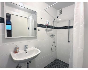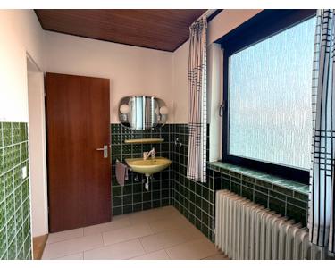 Der größere Raum (Grundriss III) verfügt über ein integriertes Bad mit Dusche und Waschbecken. Ebenfalls auf dieser Ebene sind der Hauswirtschaftsraum (Grundriss: Installationskeller) sowie ein weiterer Raum mit Zugang über die Kelleraußentreppe in den Garten.