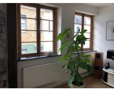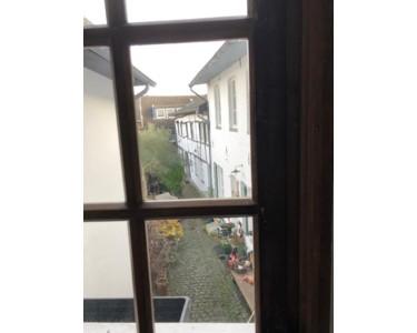 Zur Straße hin befinden sich im Erdgeschoss drei große doppelverglaste Holz-Fenster, die denen des ursprünglichen Ladens nachempfunden und vom Schreiner neu gebaut wurden.