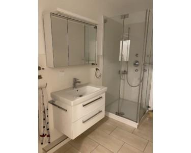 Außerdem werden die im Bad vorhandenen hochwertigen Möbel mit vermietet. Es gibt einen Spiegelschrank, einen Waschbeckenunterschrank, zwei Wandschränke und eine Kommode (siehe Bilder). Das Badezimmer verfügt über eine Lüftung.