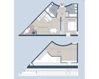 Die Wohneinheit befindet sich im Dachgeschoss und verfügt über eine Wohnfläche von ca. 72,29 m², bestehend aus 2,5 Zimmern, Küche, Bad und Flur. Der Zugang zur Galerie im Obergeschoss sowie zur Loggia erfolgt über den Wohn- und Essbereich auf der unteren Etage. Zugehörig ist ebenfalls ein eigener Kellerraum, im Untergeschoss des Gebäudes.