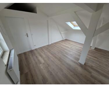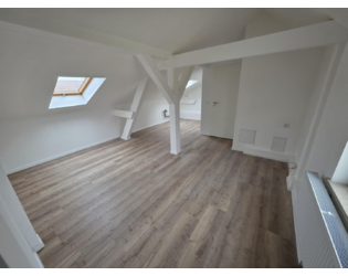 Der helle Wohnraum mit sichtbaren Dachschrägen und tragenden Balkenelementen schafft eine besondere Atmosphäre. Der hochwertige Bodenbelag in Holzoptik sorgt für Wärme und Wohnlichkeit, während die weißen Wände und klaren Linien ein modernes Gesamtbild erzeugen.