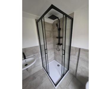 Ausgestattet mit einer großzügigen Regendusche, anthrazitfarbenen Armaturen, moderner Glasduschkabine und zeitlosen Fliesen – stilvoll, hochwertig und absolut zeitgemäß.