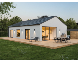 Entdecken Sie die Möglichkeiten, Ihr Traumhaus als Bungalow mit einem Satteldach zu realisieren und erleben Sie eine zeitgemäße Architektur gepaart mit einem einzigartigen Raumkonzept. Der Wohn-/Ess- und Kochbereich erstreckt sich über großzügige 44 m² und bietet höchsten Komfort. Eine halbhohe Wand, die optional auch raumhoch sein kann, trennt geschickt den Koch- vom Wohnbereich und schafft so eine harmonische Balance zwischen gemeinsamen Beisammensein und klarer Struktur. Große Panoramafenster sowie eine geräumige Panorama-Hebeschiebetür sorgen für ein helles und offenes Ambiente, das Innen- und Außenbereich harmonisch miteinander verbindet. Der Schlafbereich überzeugt mit großzügiger Stellfläche für Schränke und einem direkten Zugang zum geräumigen Badezimmer. Ein zusätzlicher Raum, flexibel als Büro, Gäste- oder Hobbyraum nutzbar, sowie ein zweites Badezimmer mit optionaler Dusche, runden das Raumangebot ab. Auf Anfrage kann der Grundriss des Bungalows auch barrierefrei gestaltet werden, um allen individuellen Bedürfnissen gerecht zu werden.
