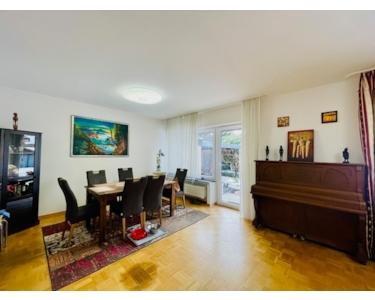 Die Aufteilung und Ausstattung ergibt sich wie folgt: Eingangsbereich und Diele mit Garderobe, ein hübsches Gäste-WC, eine moderne Küche (die helle Einbauküche verbleibt im Haus und ist im Kaufpreis enthalten), zwei gut geschnittene Kinderzimmer bzw. Büros, ein großes Elternschlafzimmer, ein helles Tageslichtbad mit Badewanne, Dusche, Waschtisch und WC, sowie ein großzügiger und sonniger Wohn-Essbereich, mit großen Fensterflächen und Ausgang auf die Terrasse und in den wunderschönen Garten. Ein Teil der Terrasse wurde überdacht und eignet sich gut als Grillecke. Im Wohnbereich und in den Schlafräumen liegt hochwertiges Stäbchen-Parkett, die Bäder und die Küche wurden jeweils mit hellen Fliesen ausgestattet.