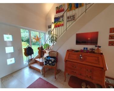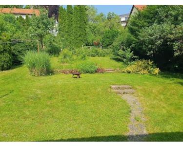 Hervorzuheben ist der große und schöne Garten vor und hinter dem Haus, der vielseitig nutzbar ist. In einem Raum neben dem Eingang zur Einliegerwohnung können Gartengeräte etc. untergestellt werden. Zum Haus gehört auch eine Einzelgarage, die aber deutlich breiter ist als üblich.