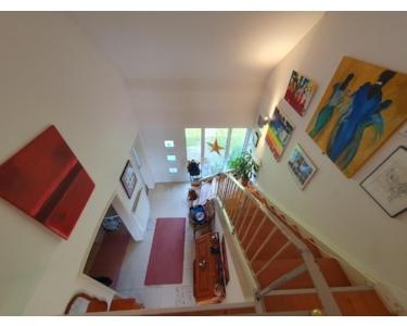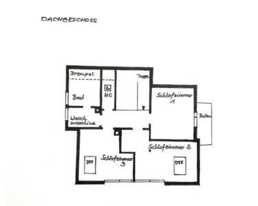 Wir haben das Haus 2007 gekauft und als erstes das Dach gedämmt und neu eingedeckt. Nach und nach haben wir die alten Holzfenster in Kunststofffenster mit Zwei- und Dreifachverglasung getauscht. Es sind nur noch einzelne Holzfenster übrig. Auch das Eingangstürelement wurde erneuert. Im DG haben wir die Raumaufteilung geändert. Es gibt jetzt auf der Ostseite ein Schlafzimmer mit kleinem Balkon und auf der Südseite zwei gemütliche und helle Zimmer, die etwa gleich groß sind. Die Bäder sind im Jahr 2000 neu gemacht worden, nicht allzu groß, aber funktional gestaltet.