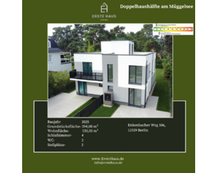 Diese Doppelhaushälfte mit 150 m² Wohnfläche auf drei Ebenen liegt im idyllischen Stadtteil Berlin-Müggelheim, umgeben von Seen und Wäldern. Das Haus verbindet Natur, Komfort und Energieeffizienz (A+) – und ist sofort bezugsfertig. Der Verkauf erfolgt direkt vom Bauträger – provisionsfrei.