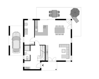 Das moderne Energiesparhaus mit Carport setzt mit einer Wohnraumerweiterung und einem überdachten Eingangsbereich, Übereck-Fenstern und einem Carport Akzente. Durch die Wohnraumerweiterung im Eingangsbereich entsteht ein separater Raum für die Garderobe. Der offen gestaltete Wohn-/Ess- und Kochbereich ist großzügig angelegt. Eine XXL-Panorama-Hebeschiebetür, Terrassentüren und bodentiefe Fensterelemente, die übereck angeordnet sind, fluten den gesamten Wohnbereich mit Tageslicht.
