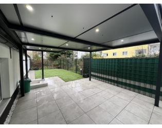Das Herzstück der Wohnung ist die große Terrasse (auf der Rückseite des Hauses), die durch ihre Gestaltung nahezu wie ein eigener Garten wirkt. Der Außenbereich unterteilt sich in eine überdachte rechte Seite (ideal für wettergeschützte Lounge‑Möbel oder einen Essbereich im Freien) sowie eine linke Seite (mit Kunstrasen und Freifläche). Unter der Überdachung wurden praktische Deckenspots verbaut, die auch am Abend eine angenehme Atmosphäre schaffen und den Außenbereich besonders einladend wirken lassen.