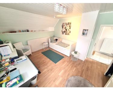 Im Obergeschoss verfügt man über 3 Zimmer zwischen ca. 14 m² und ca. 16 m² Raumgröße, ein Duschbad und eine Pantryküche, sowie über einen großzügigen Flur, der auch als Arbeitsraum genutzt werden kann. Über eine normale Treppe gelangen Sie ins beheizte Dachzimmer und über eine noch einzubauende Raumspartreppe in die (Spiel)-Galerie.