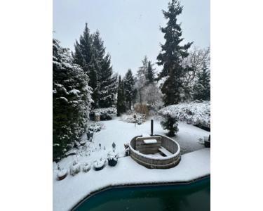 Vom Wintergarten gelangen Sie auf die Terrasse mit integriertem Pool und beheizbarem Badefass. Gemütlichen Abenden mit Entspannung steht demnach nichts mehr im Wege. Ein Teich mit Biotop bietet eine Ruhezone um nach dem anstrengendem Alltag abzuschalten.