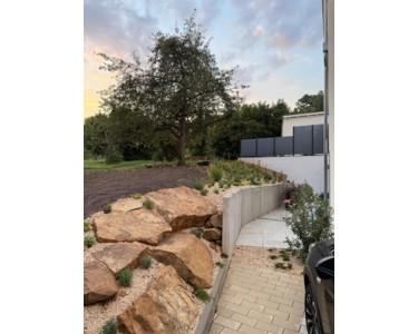 - Terrasse mit hochwertigem Belag, Milchglasgeländer, Stromanschluss und integrierter Beleuchtung. Professionell gestaltet durch einen renommierten Landschaftsgärtner, mit Cortenstahl-Beet und stimmungsvoller Außenbeleuchtung.